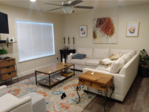 Our safe house is at an undisclosed location in California. This location offers 5 rooms in a “home-like” setting. Each tenant has their own bedroom as well as access to 1-1/2 bathrooms, living room, kitchen, and laundry room.